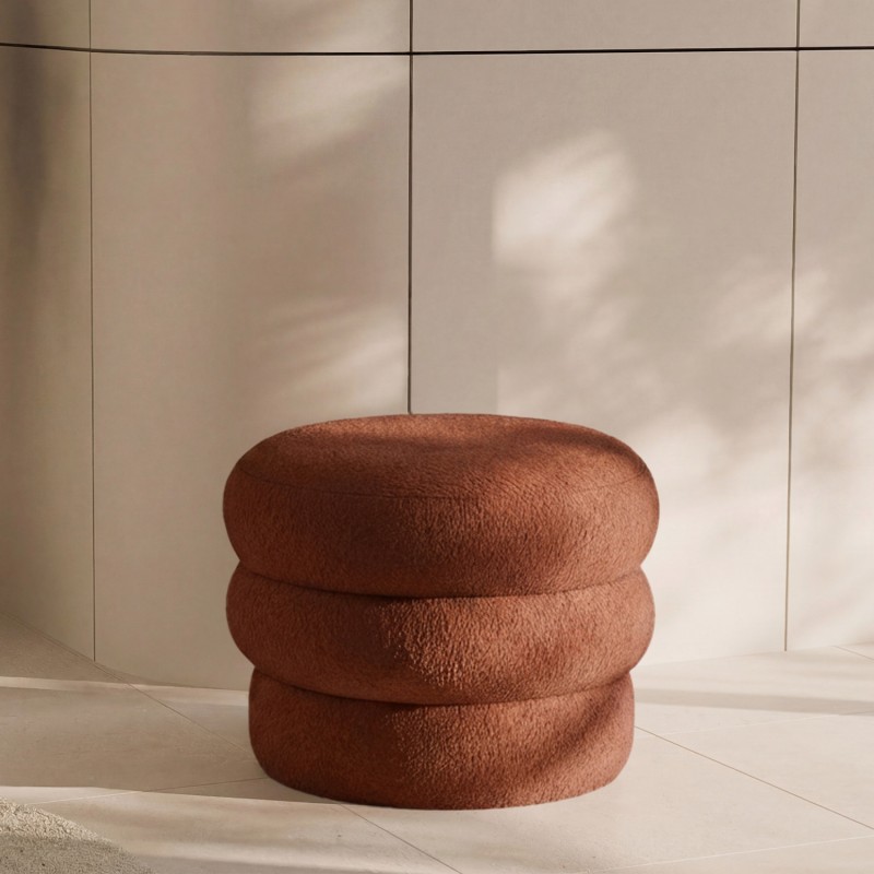 El puff ELLIOT puede utilizarse como asiento auxiliar frente al sofá, como complemento en un dormitorio o vestidor, o como apoyo ocasional en una zona de lectura. Su diámetro de 55 cm proporciona mayor superficie que modelos más compactos, resultando más cómodo para adultos, pero manteniendo una forma redonda fácil de mover.