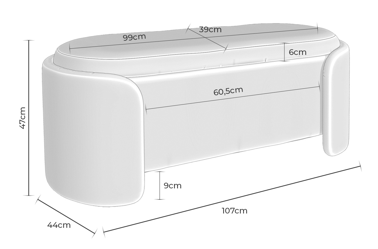 • Dimensiones: 107 cm ancho · 44 cm fondo · 47 cm alto (±2 cm)