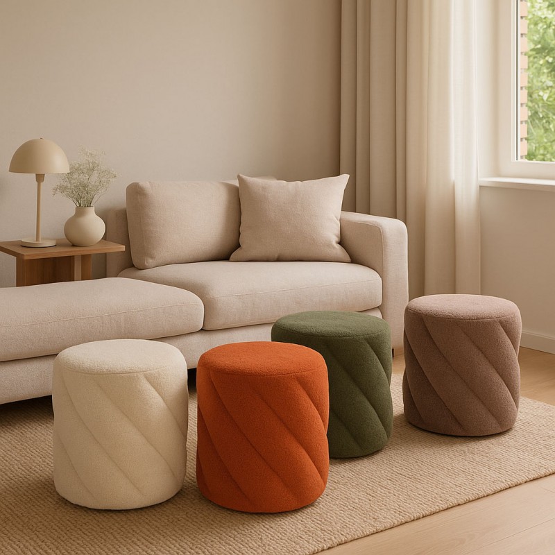 El puff tapizado DEREK está disponible en una paleta de colores suaves y atemporales como el beige, verde, taupe y terracota. Esta variedad permite integrarlo fácilmente en diferentes estilos de decoración.