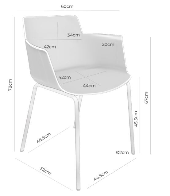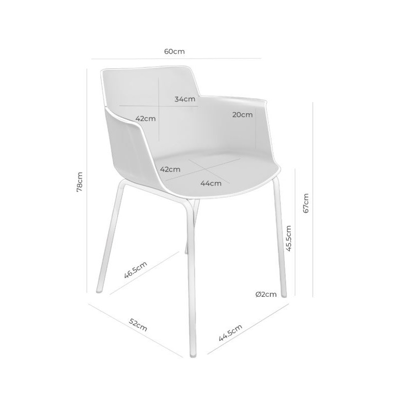 La silla DOLLY es una silla de comedor con brazos fabricada en polipropileno, diseñada para mesas de comedor o cocinas donde se busca un asiento cómodo y fácil de mantener.