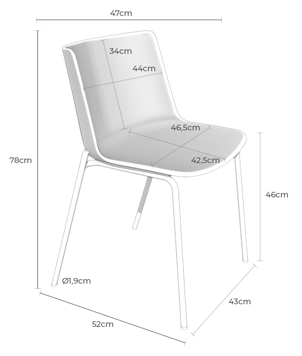 Las medidas son: 47 cm. de ancho x 52 cm. de fondo y 78 cm. de alto. La altura del asiento es de 45,5 cm., tiene un fondo de 42 cm. y un ancho de 47 cm. La altura del respaldo es de 33 cm. y su ancho es de 44 cm. El peso de cada silla es de 5 kg. y admite un peso de carga de 110 kg.