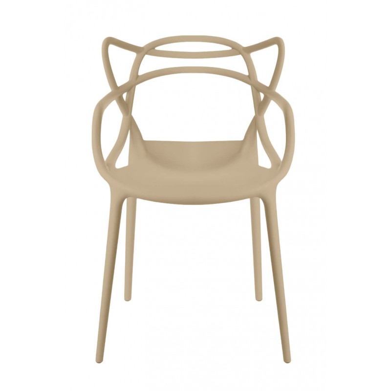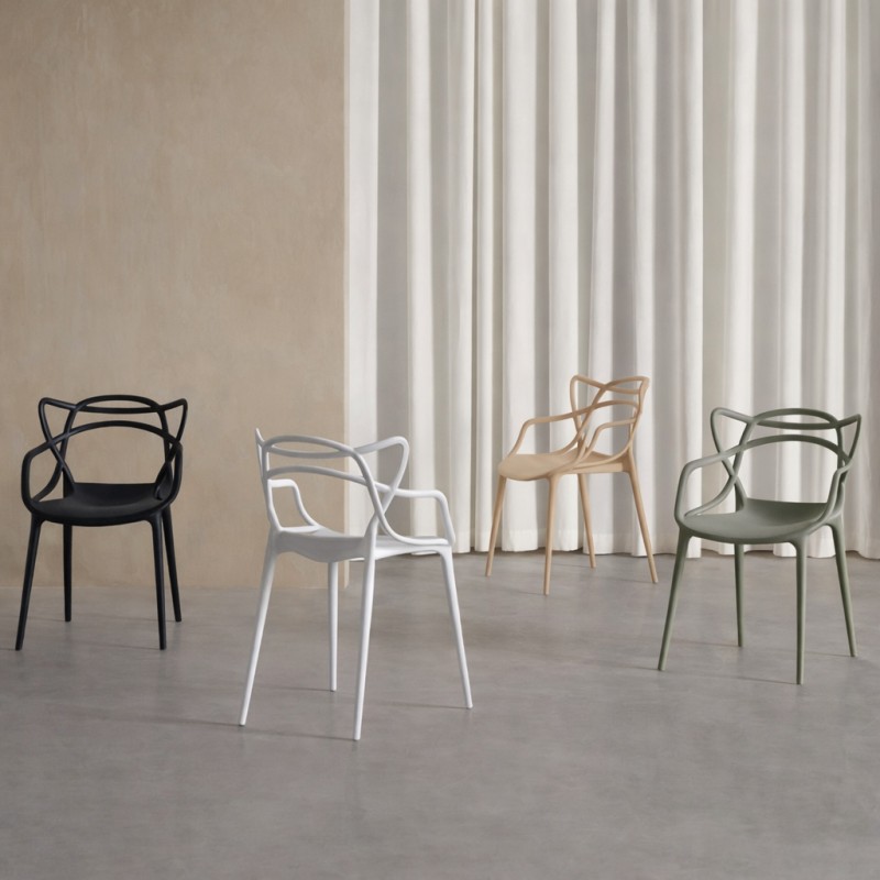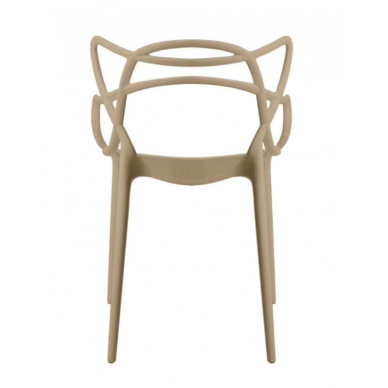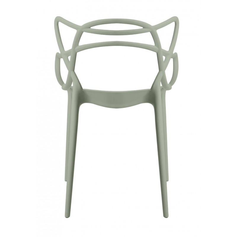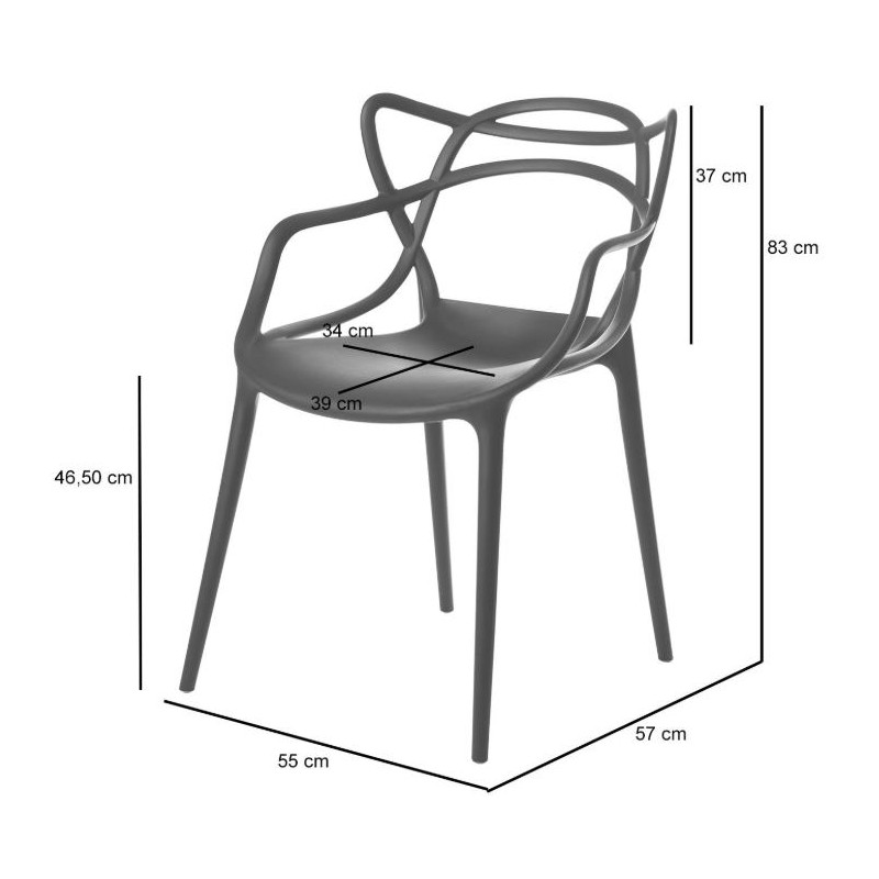 El diseño curvado y entrelazado del respaldo aporta identidad visual y encaja en ambientes modernos, minimalistas y contemporáneos. La estructura en polipropileno resistente ofrece ligereza (4,50 kg) y facilita su limpieza diaria, manteniendo un uso cómodo gracias a su respaldo ergonómico y brazos integrados.
