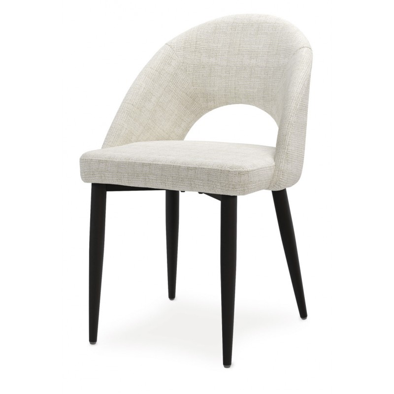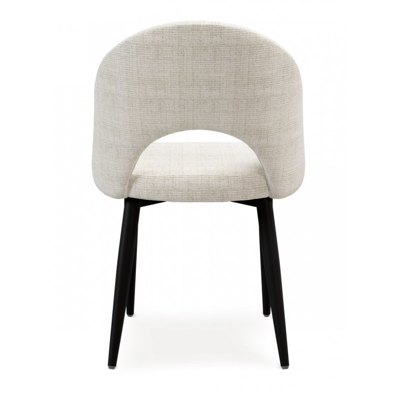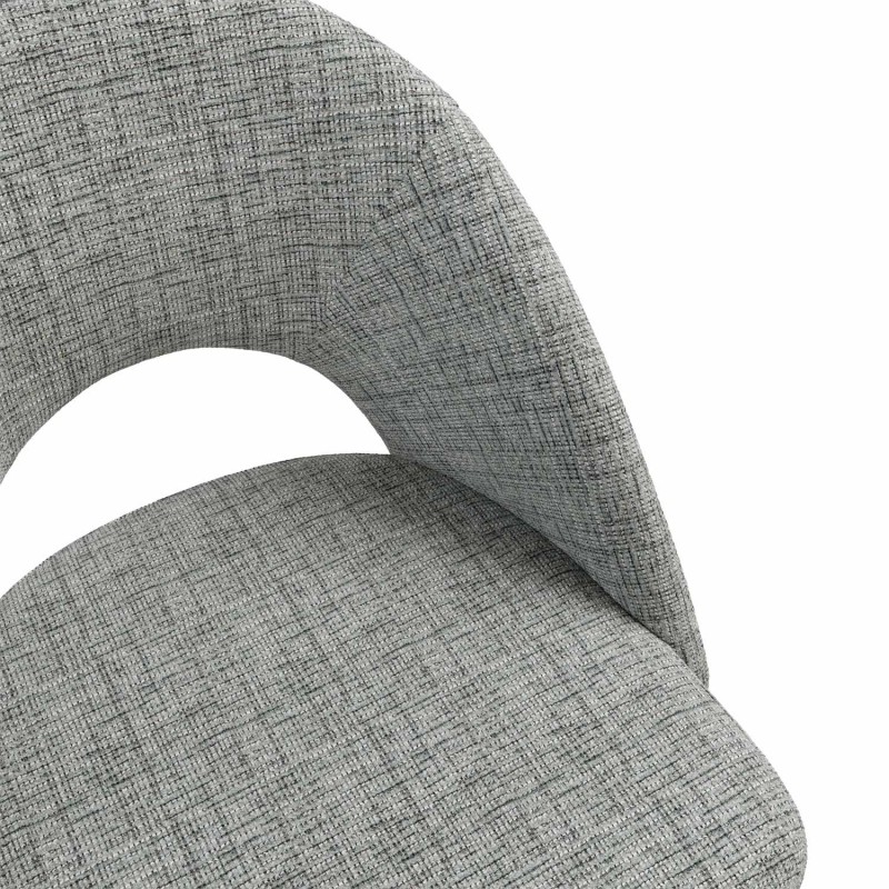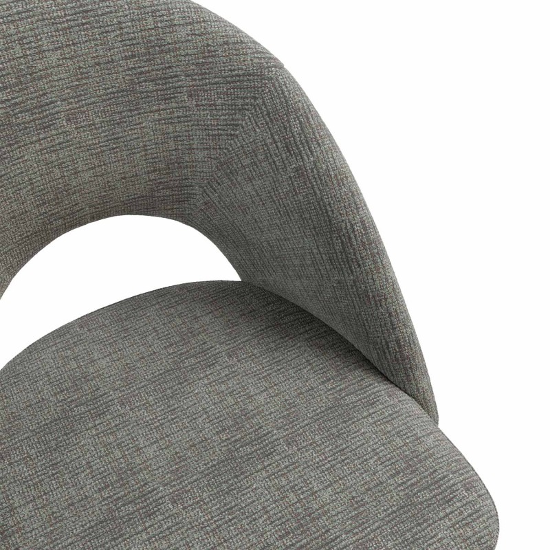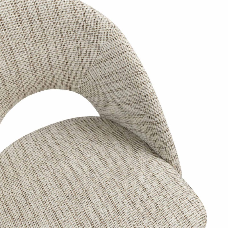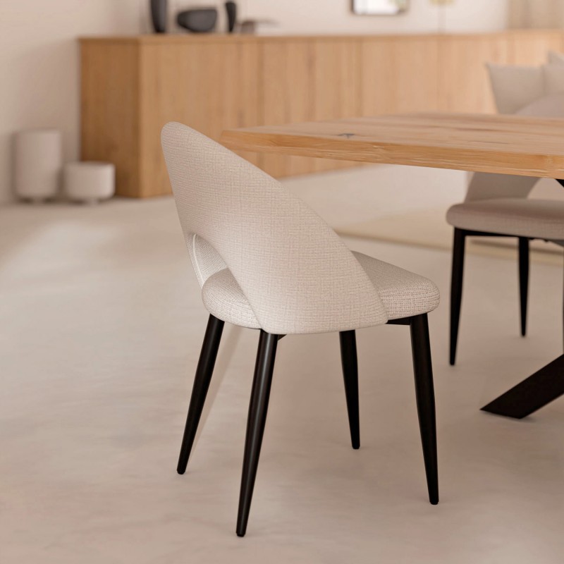 El respaldo y el asiento acolchados están tapizados en un tejido suave y resistente, disponible en varios tonos neutros que aportan calidez sin recargar el espacio. La apertura curvilínea del respaldo es un detalle distintivo que potencia su diseño ergonómico y visualmente ligero.