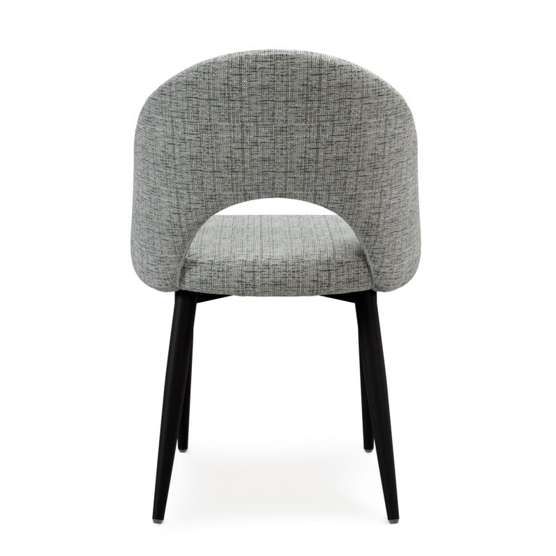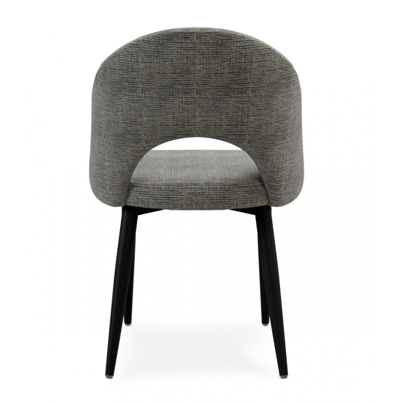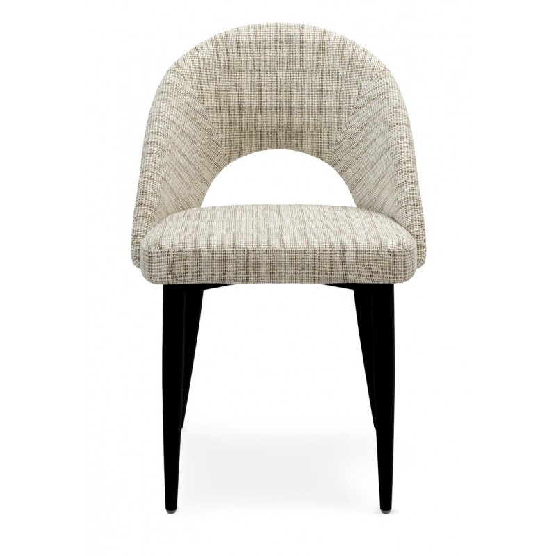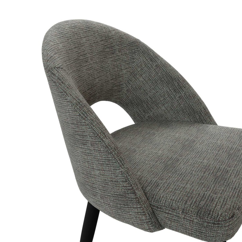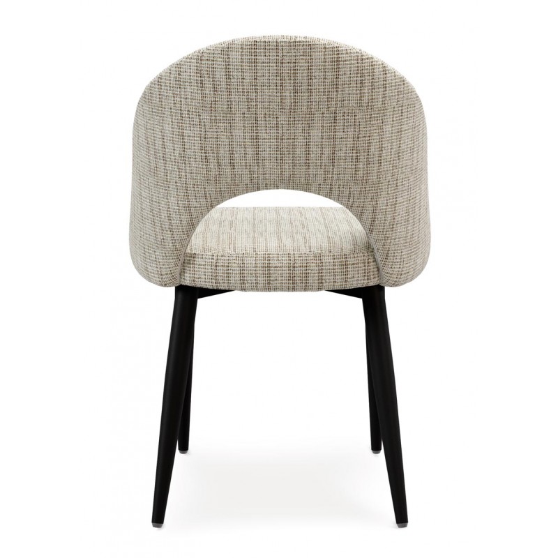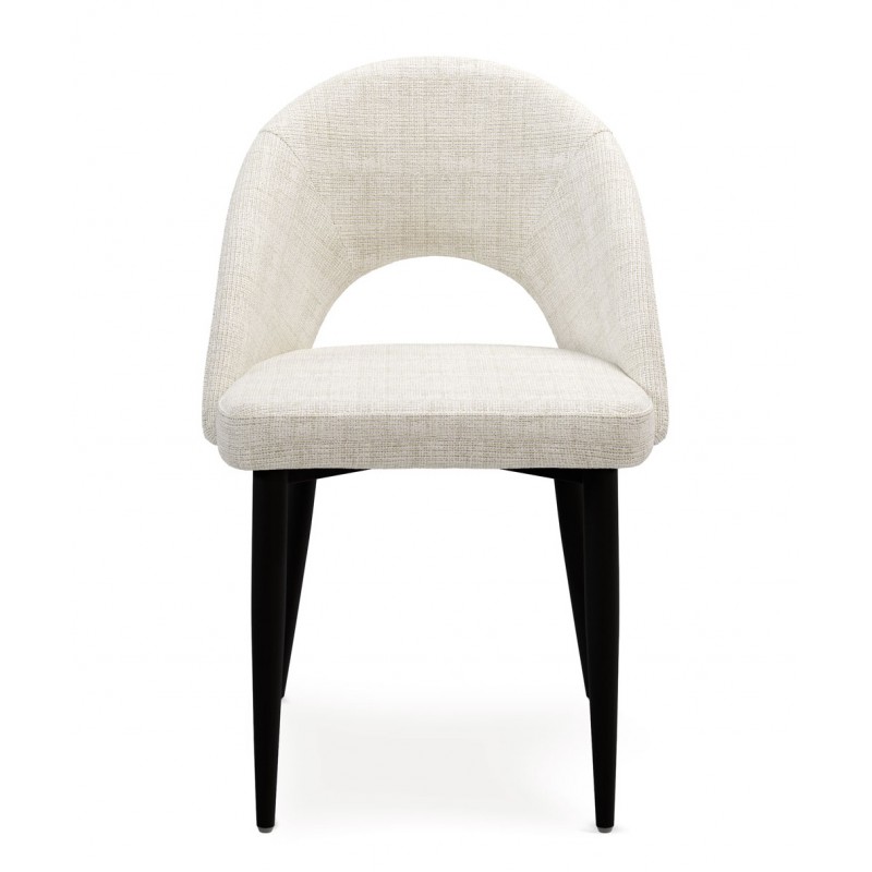 El respaldo y el asiento acolchados están tapizados en un tejido suave y resistente, disponible en varios tonos neutros que aportan calidez sin recargar el espacio. La apertura curvilínea del respaldo es un detalle distintivo que potencia su diseño ergonómico y visualmente ligero.