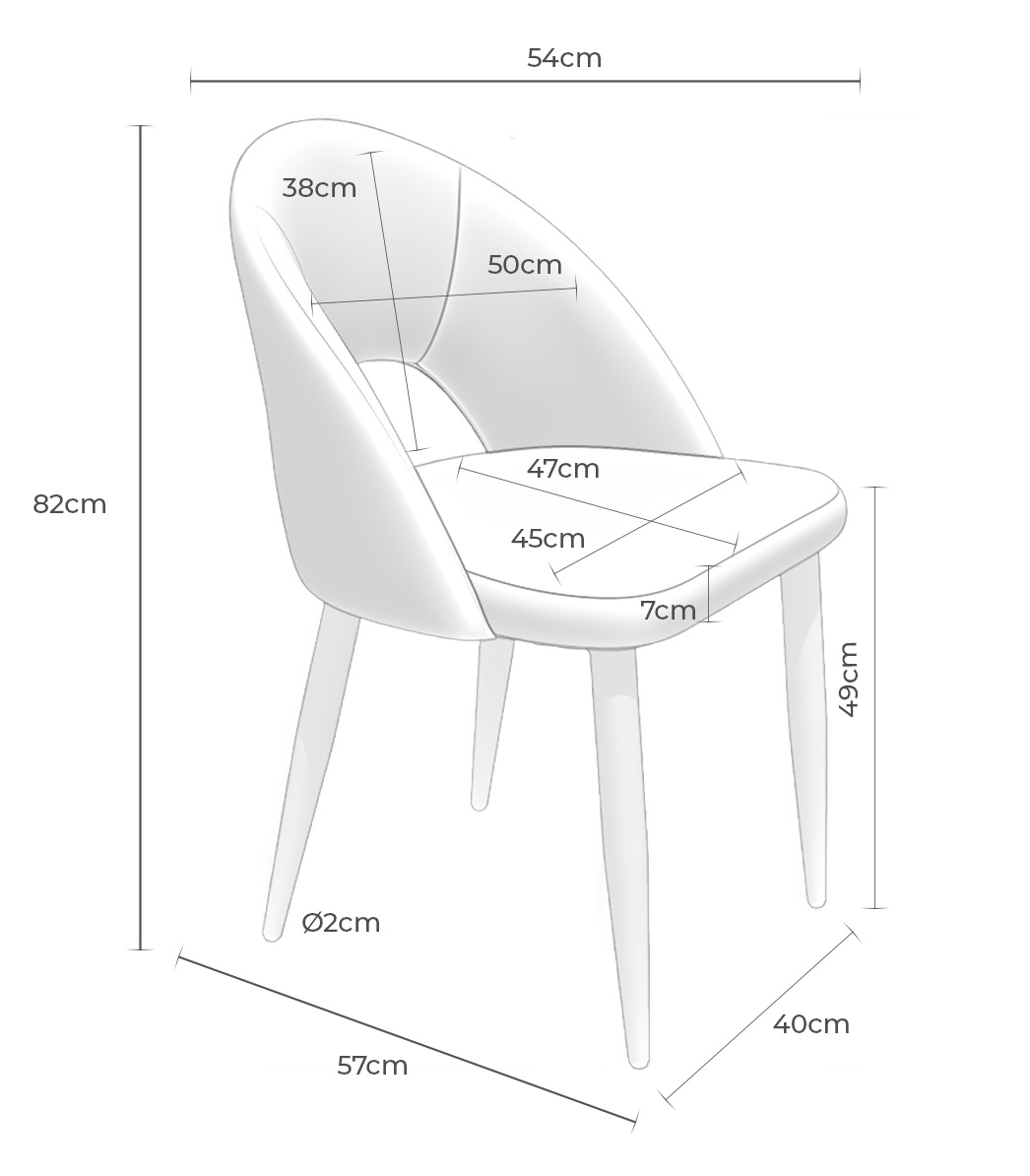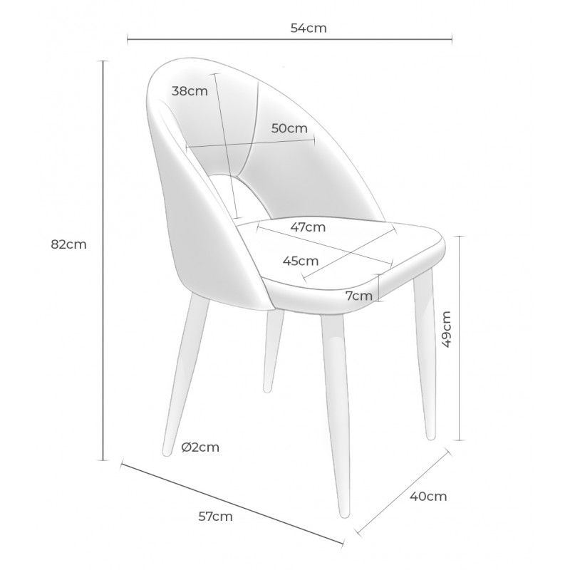 Las medidas son: 58cm. de ancho x 53cm. de fondo x 82cm. de altura. El peso de cada silla es de 7,5kg. y admite un peso de carga de 120 kg. La estructura es de acero reforzado de 38 mm. y las patas de acero negro en acabado polvo mate. La espuma es HR de 30kg. de densidad. El resto de medidas puede consultarlas en el gráfico que aparece debajo y también en las fotografías.