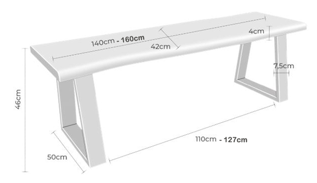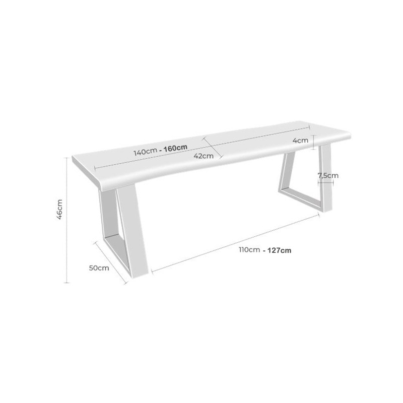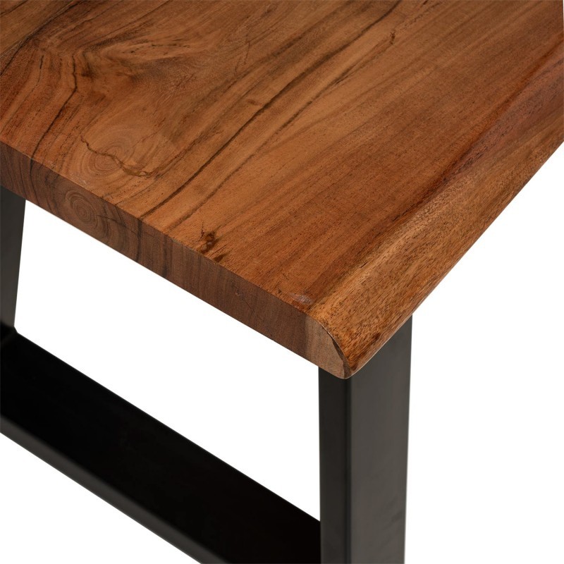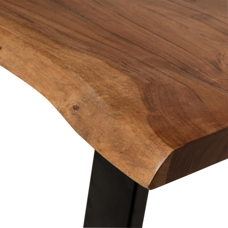 El banco TANAY destaca por su diseño robusto y natural, con un sobre de madera maciza de acacia que exhibe bordes curvilíneos e irregulares, resaltando la singularidad de cada pieza. Las vetas marcadas y el acabado natural aportan autenticidad visual.