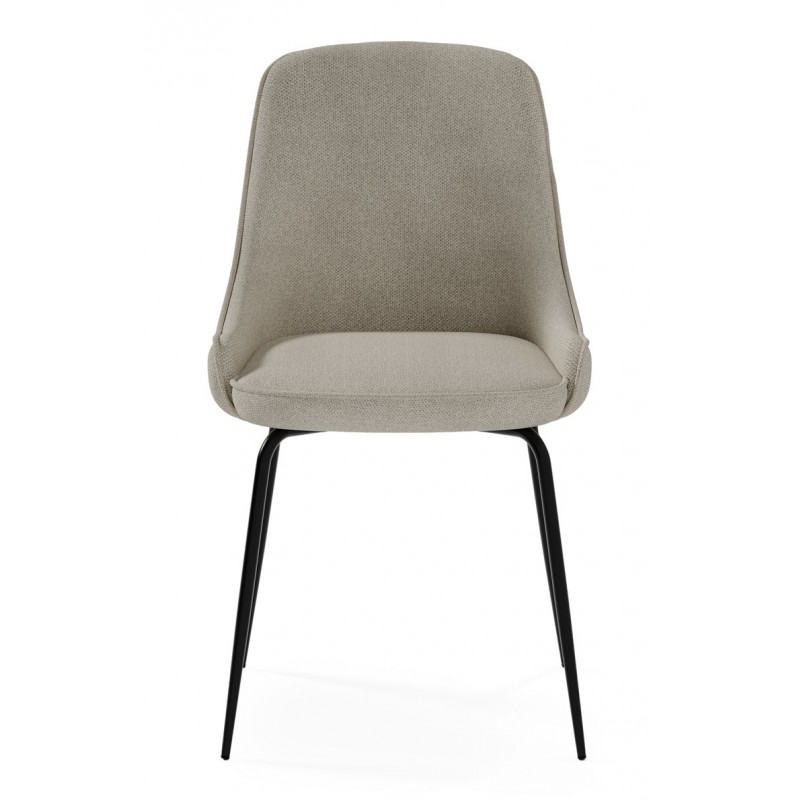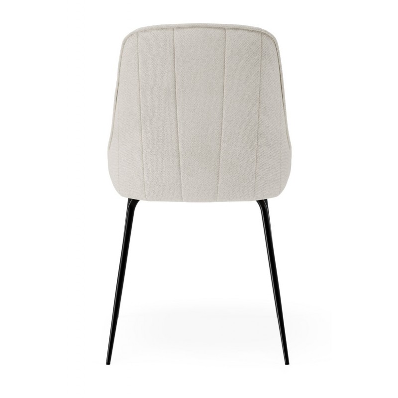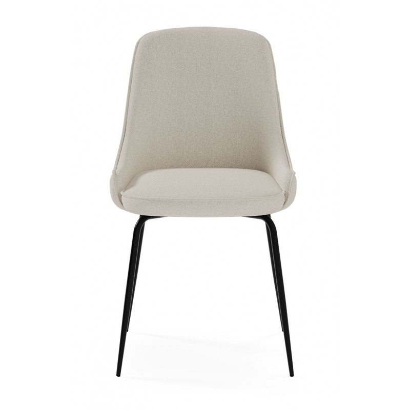 La estructura está compuesta por patas metálicas negras que aportan estabilidad y resistencia, con una estética minimalista. La silla no es apilable ni giratoria y requiere montaje.