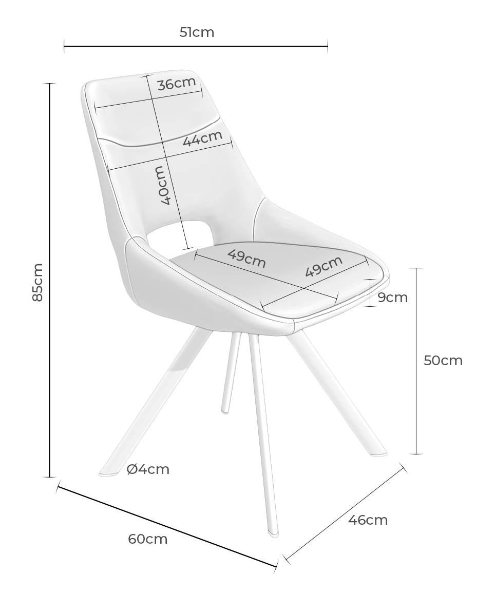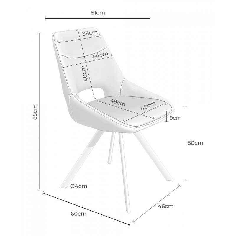 • Altura del asiento: 50 cm | Altura del respaldo: 40 cm | Ancho del respaldo: 44 cm | Ancho del asiento: 49 cm | Fondo del asiento: 49 cm.