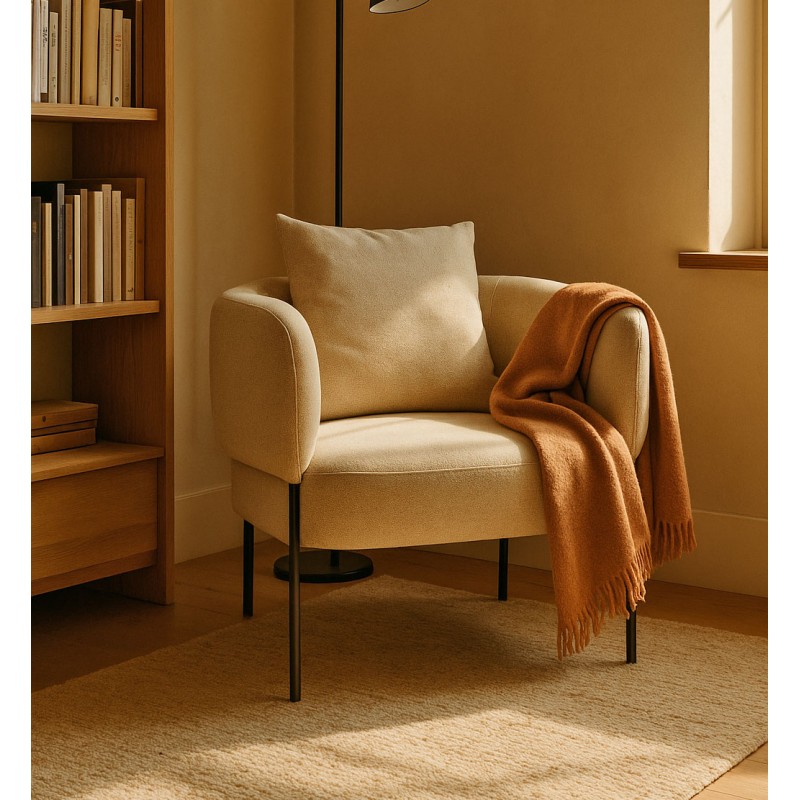 Sillón con brazos AGADIR tapizado en tejido 100% poliéster. Las patas son de acero negro. Además, para que el asiento sea mucho más cómodo se ha añadido un pequeño cojín en el respaldo.