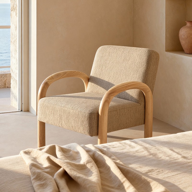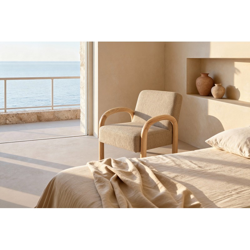 La butaca DOROTHY es una butaca tapizada en poliéster con tratamiento antimanchas y con estructura de madera maciza pensada para salones, dormitorios amplios o espacios de lectura que buscan una estética cálida y actual. Sus patas y reposabrazos curvados en madera de hevea natural aportan solidez y un carácter orgánico propio del estilo nórdico y japandi.