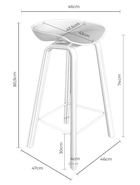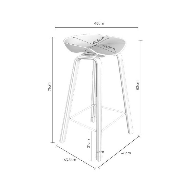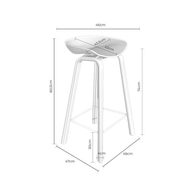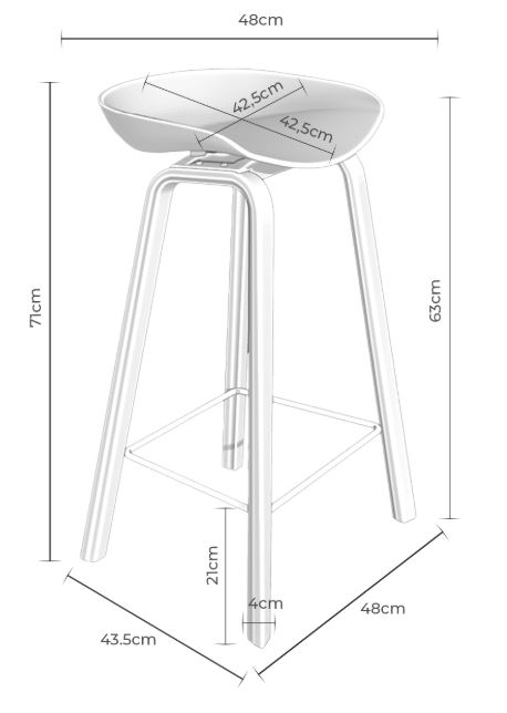 Disponible en dos medidas: 48 cm. de ancho x 44 cm. de fondo x 71 cm. de alto y 46 cm. de ancho x 47 cm. de fondo x 81 cm. de alto. La altura del asiento es de 63 y 74 cm. respectivamente y tiene un ancho de 43 cm. y una profundidad de 43 cm. Tiene un reposapiés a 21 y 30 cm. del suelo, según el taburete. Su peso es de 4,3 y 4,5 kg. y soporta un peso de 100 kg. El resto de medidas puede consultarlas en el gráfico que aparece debajo y también en las fotografías.