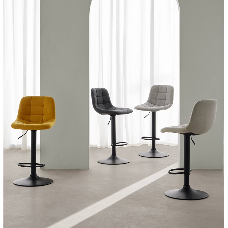 Taburete giratorio y elevable ASHA con el respaldo y el asiento tapizado en tejido 100% poliéster y la estructura de metal negro en acabado lacado mate. Está acolchado con espuma. La estructura del asiento y respaldo es de madera contrachapada.