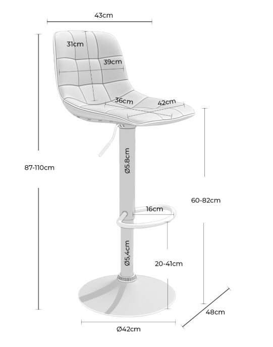 Las medidas son: 42,5 cm. de ancho x 46 cm. de fondo y 89-110 cm. de alto. La altura del asiento es de 61-83 cm., tiene un fondo de 35 cm. y un ancho de 42,5 cm. La altura del respaldo es de 30 cm. y su ancho es de 31 cm. La altura del suelo al reposapies es de 18-40,5 cm. El diámetro del pie es de 41,5 cm. El peso de cada taburete es de 6,3 kg. y admite un peso de carga de 120 kg.