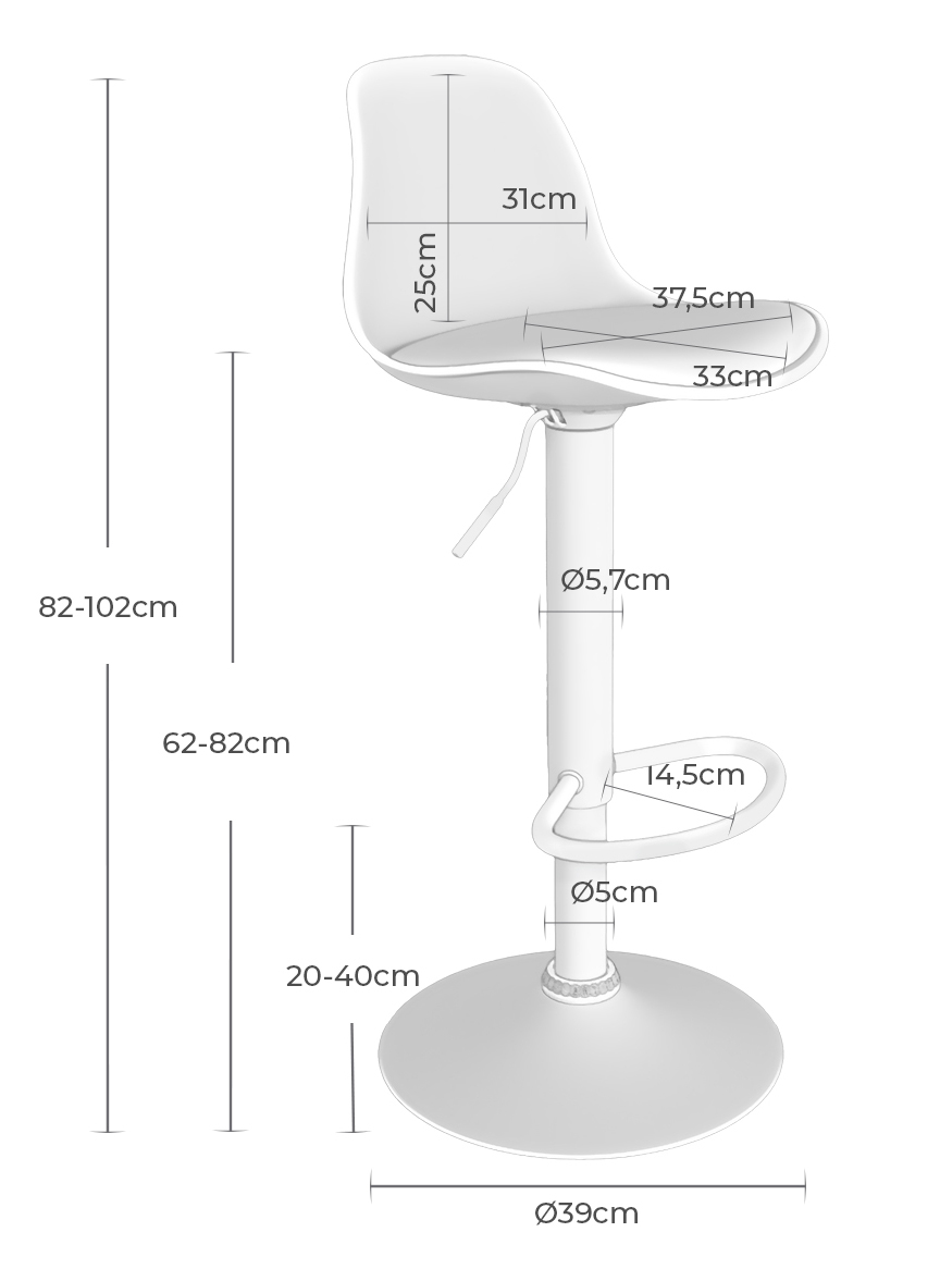 Las medidas son: 38 cm. de ancho x 40 cm. de fondo y 85,5-103,5 cm. de alto. La altura del asiento es de 62-84 cm., tiene un fondo de 31 cm. y un ancho de 33,5 cm. La altura del respaldo es de 23 cm. y su ancho es de 24 cm. La altura del suelo al reposapies es de 18,5-40 cm. El diámetro del pie es de 38,5 cm. El peso de cada taburete es de 5,6 kg. y admite un peso de carga de 90 kg.