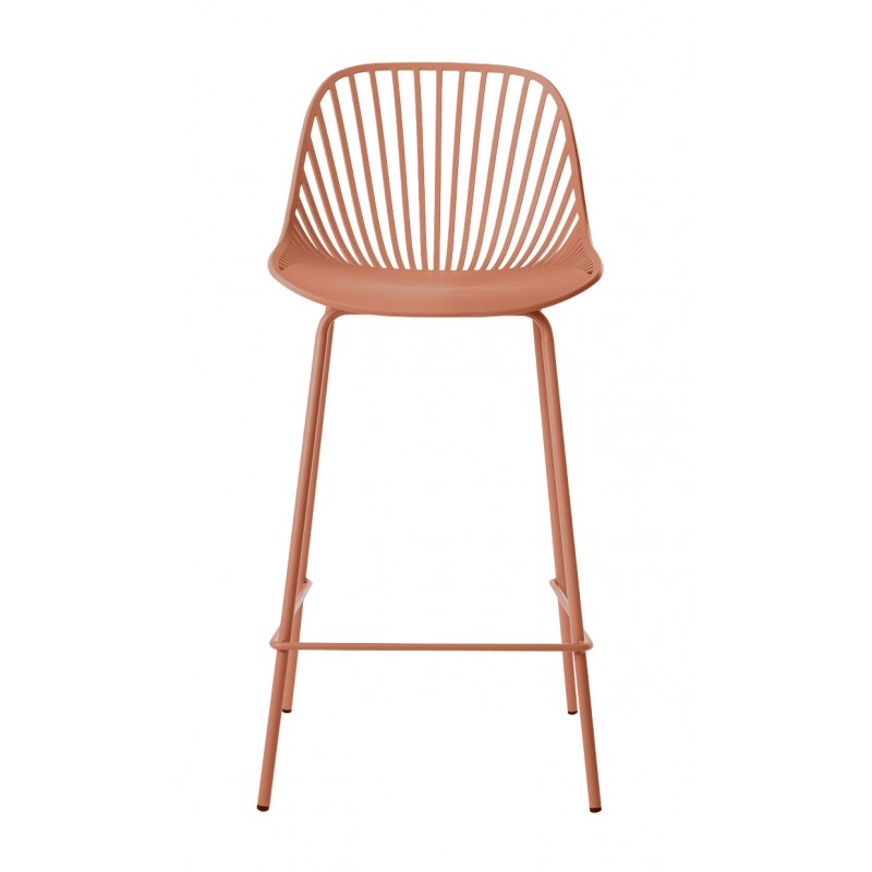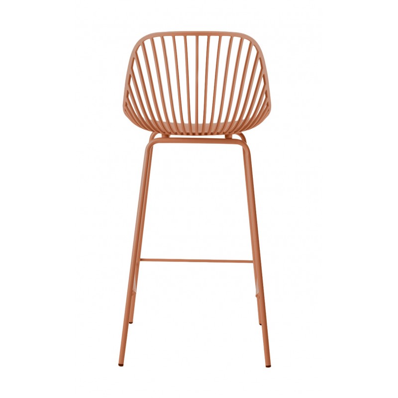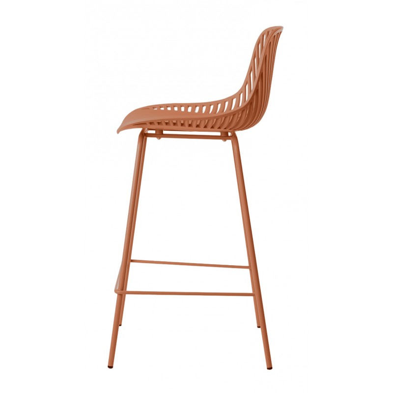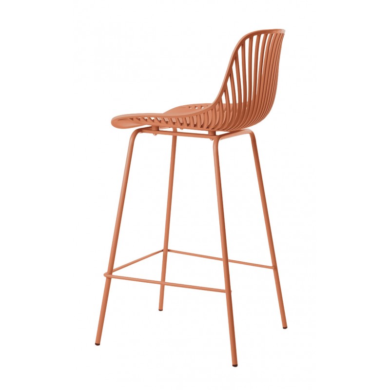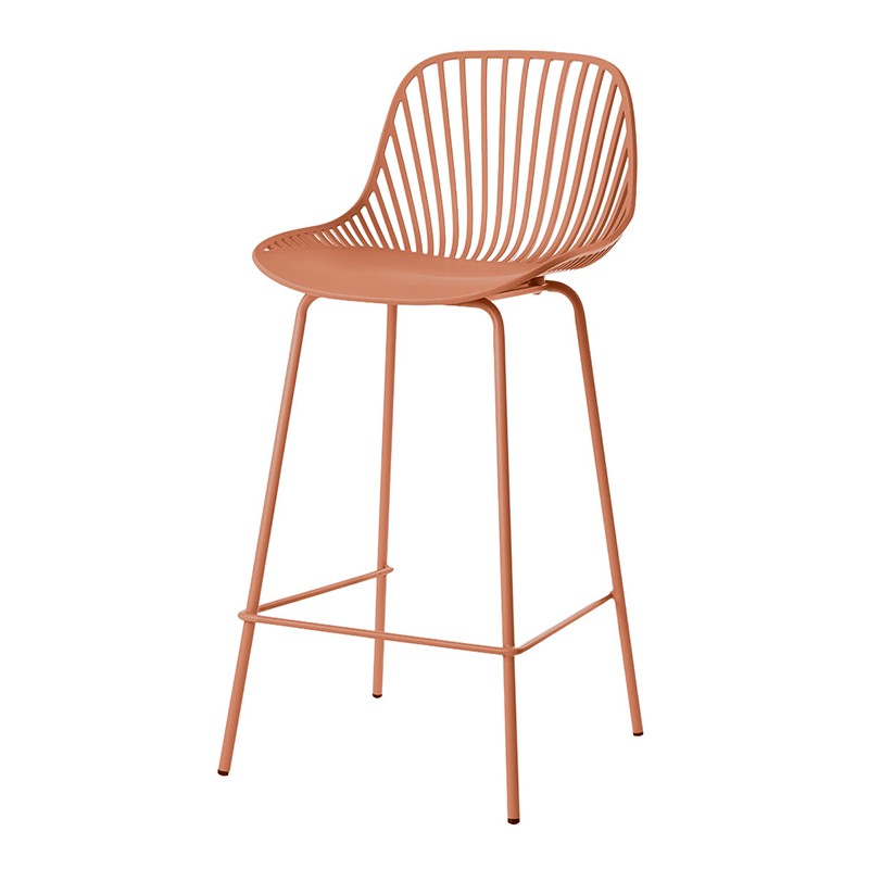 Las patas metálicas, acabadas en lacado mate a tono con el asiento, aportan estabilidad, durabilidad y un toque industrial que se integra fácilmente en decoraciones nórdicas, minimalistas o urbanas. El reposapiés metálico incrementa el confort sin perder elegancia.