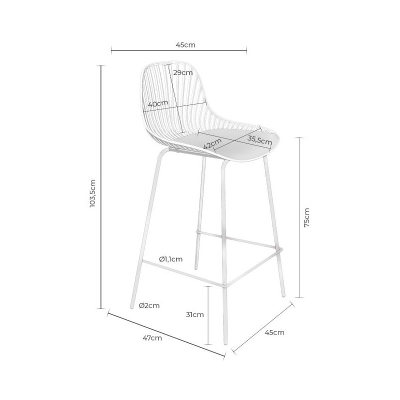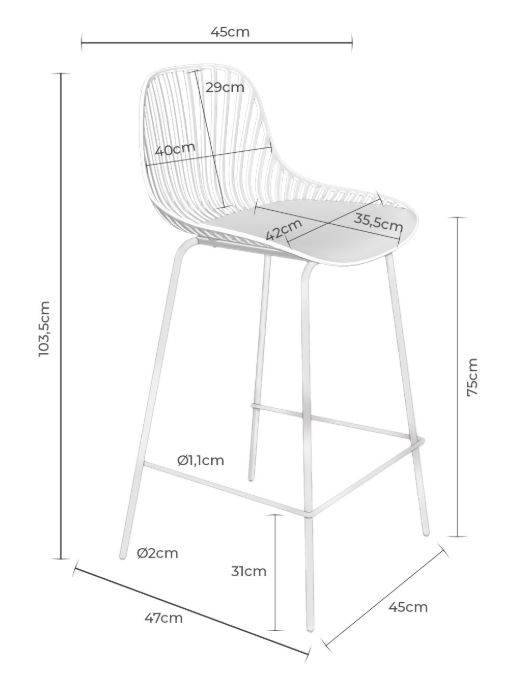 Las medidas del alto son: 45 cm. de ancho x 47 cm. de fondo y 103,5 cm. de alto. La altura del asiento es de 75 cm., tiene un fondo de 35,5 cm. y un ancho de 42 cm. La altura del respaldo es de 29 cm. y su ancho es de 40 cm. La altura del suelo al reposapies es de 31 cm. El peso de cada taburete es de 5,5 kg. y admite un peso de carga de 120 kg. El resto de medidas puede consultarlas en el gráfico que aparece debajo y también en las fotografías.