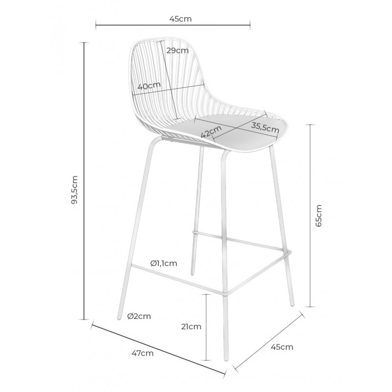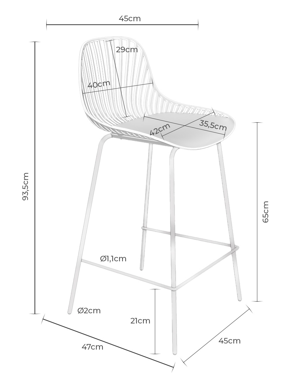 Las medidas del bajo son: 45 cm. de ancho x 47 cm. de fondo y 93,5 cm. de alto. La altura del asiento es de 65 cm., tiene un fondo de 35,5 cm. y un ancho de 42 cm. La altura del respaldo es de 29 cm. y su ancho es de 40 cm. La altura del suelo al reposapies es de 21 cm. El peso de cada taburete es de 5 kg. y admite un peso de carga de 120 kg. El resto de medidas puede consultarlas en el gráfico que aparece debajo y también en las fotografías.