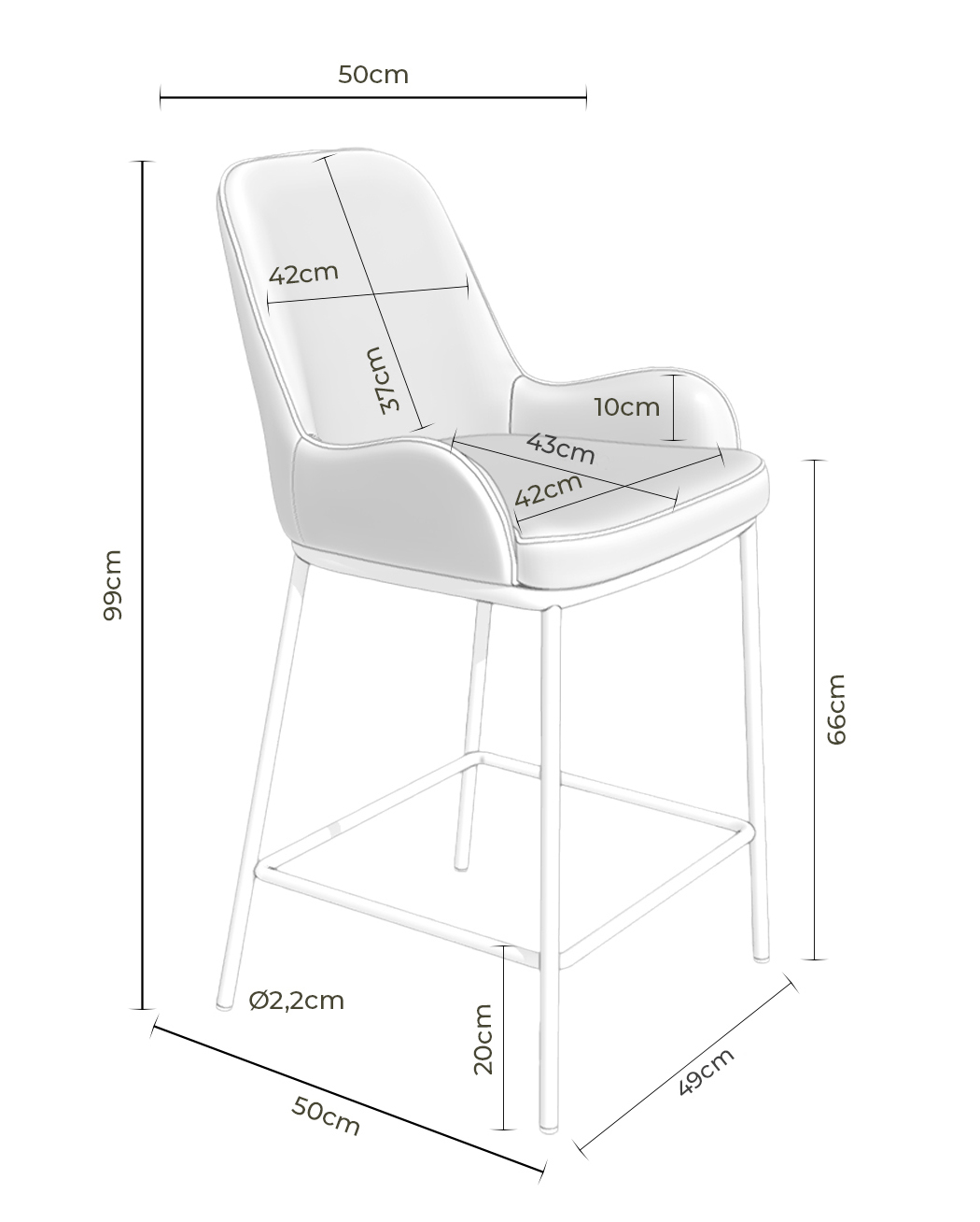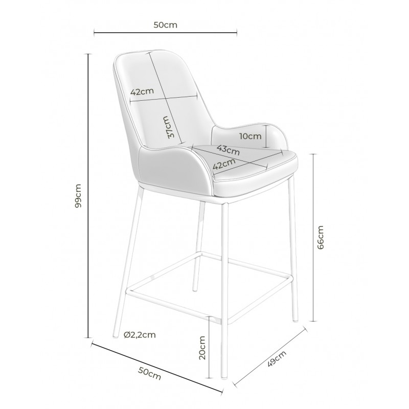Las medidas son: 51,5 cm. de ancho x 56 cm. de fondo y 98,5 cm. de alto. La altura del asiento es de 65 cm., tiene un fondo de 42 cm. y un ancho de 38 cm. La altura del respaldo es de 34,5 cm. y su ancho es de 33 cm. La altura del suelo al brazo es de 73 cm. y mide 10 cm. La altura del suelo al reposapies es de 19 cm. El peso de cada taburete es de 7,5 kg. y admite un peso de carga de 120 kg. El resto de medidas puede consultarlas en el gráfico que aparece debajo y también en las fotografías.