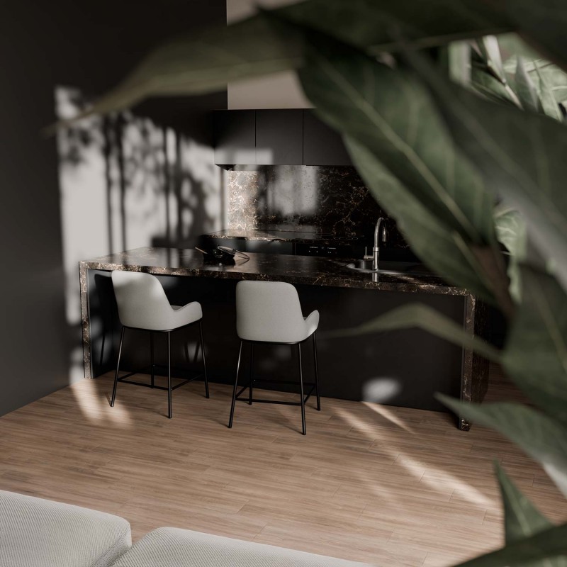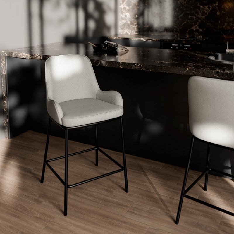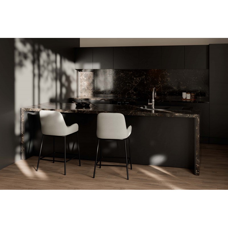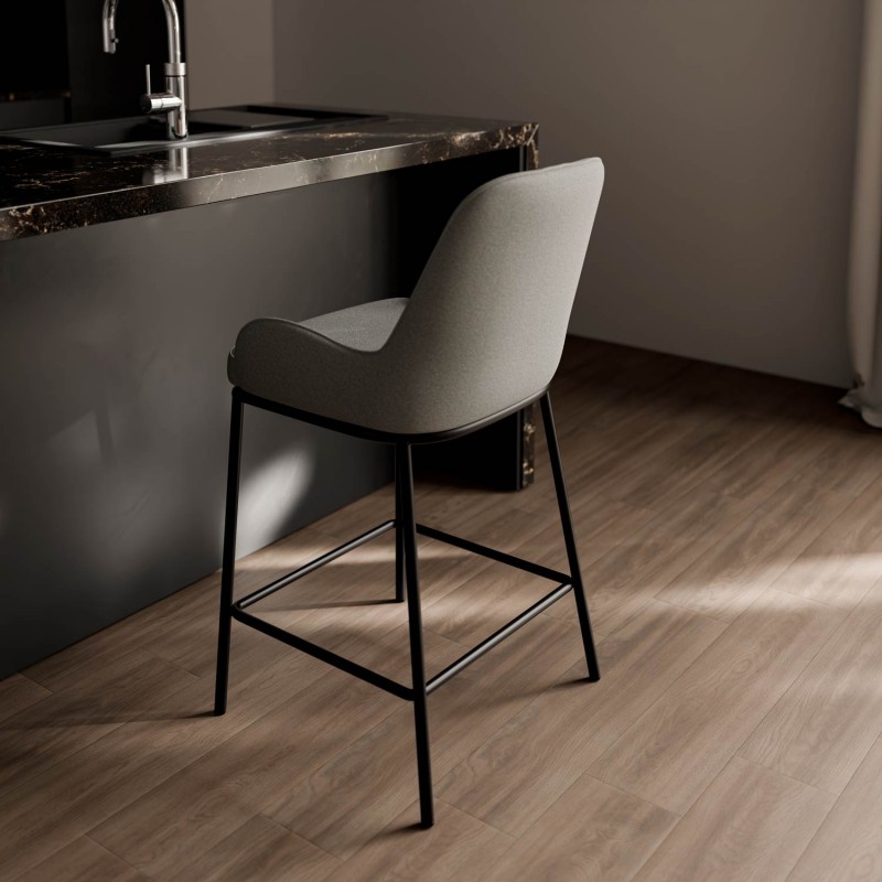 El taburete MILTON destaca por su diseño contemporáneo y su cuidada ergonomía, ideal para cocinas con isla o barras de desayuno. Su asiento tapizado en tejido gris oscuro o claro de textura suave brinda una sensación de confort que invita a disfrutar de largas sobremesas.