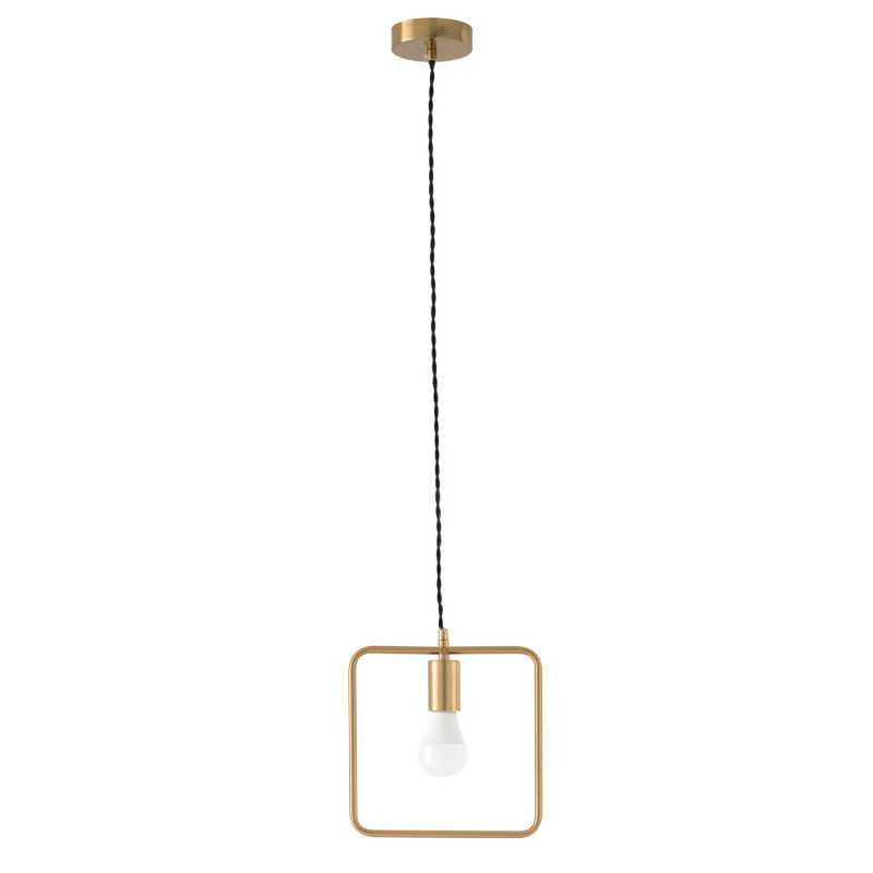 El uso de latón dorado genera reflejos cálidos que enriquecen visualmente el entorno, mientras que el cable de tela y la pletina metálica completan el conjunto con un acabado elegante.
